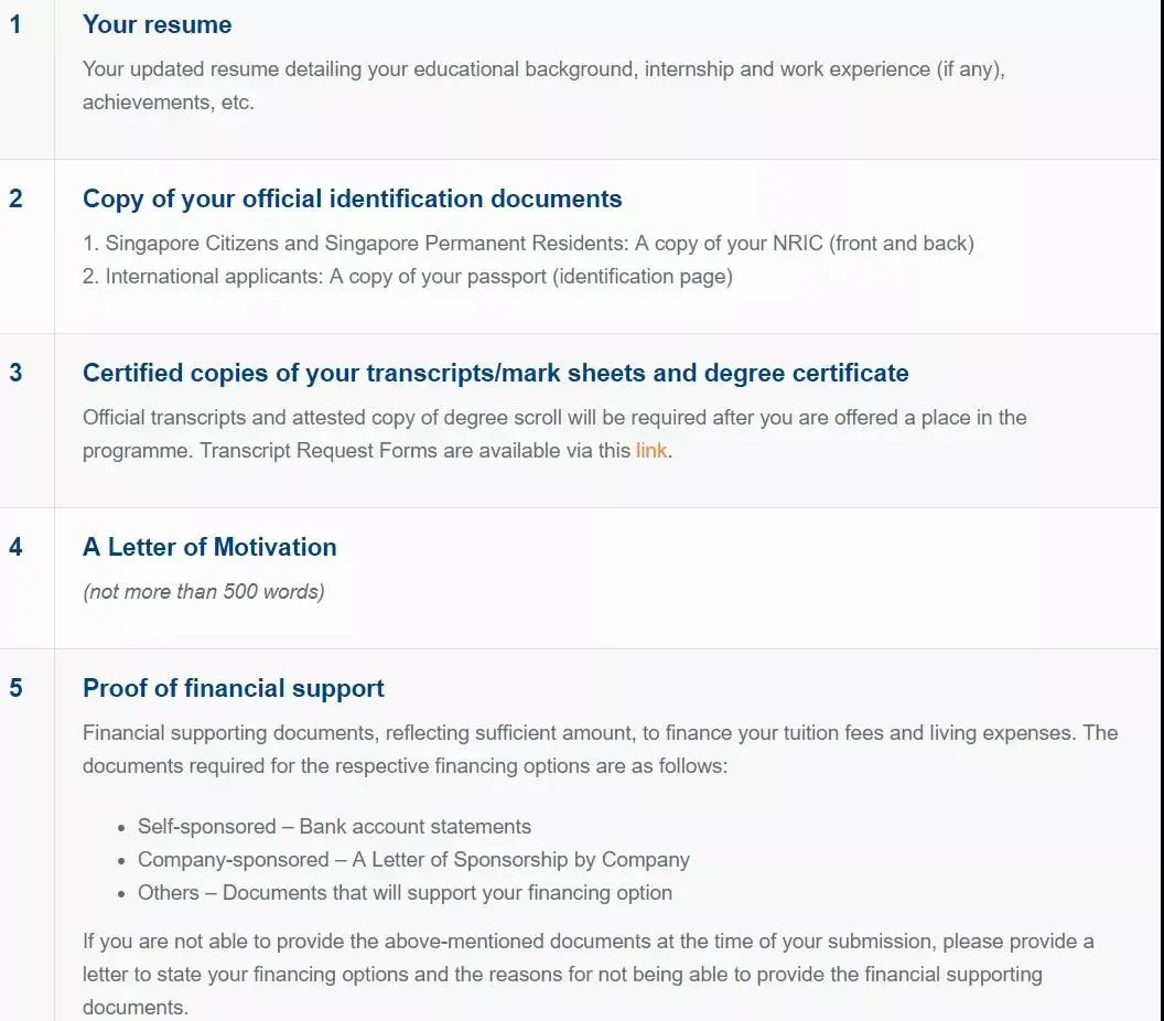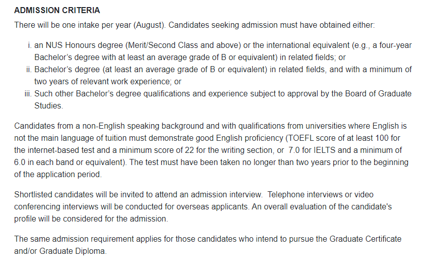 1. 新加坡国立大学荣誉学位(优等/二等及以上)或相关领域的国际同等学历(如四年制学士学位,绩点至少为B或同等水平);