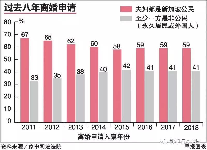 根据新加坡家事司法法院首次公布的涉及国籍的离婚申请数据显示,涉及新加坡籍夫妇的离婚率有下跌趋势,夫妻都是新加坡公民的离婚申请,从2011年占总数的67%,降至2016年的59%,并且从2016年起,一直维持在59%。