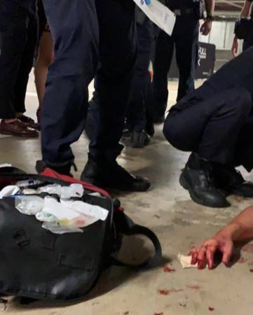在闪避不及的情况下,尤金的左膝盖被砍了一刀,右小腿也中了两刀。他的一名朋友见状出手相救,但持刀男子却拿起刀子往友人的脸部割去,导致左耳和右眉毛都被割伤。