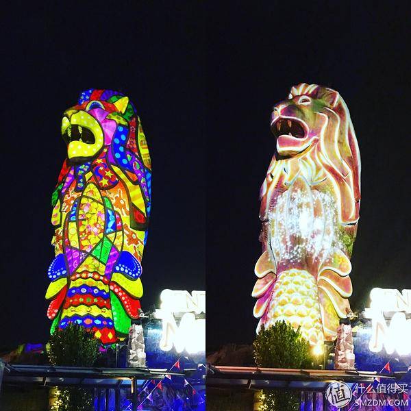 鱼尾狮是新加坡的形象标志,圣淘沙的鱼尾狮塔高37米,游客可以付费爬上去看风景,整个圣淘沙岛尽收眼底。晚上的灯光秀是最吸引人的,但是放光的鱼尾狮也有点小瘆人,好像一头电影里的巨兽一样。