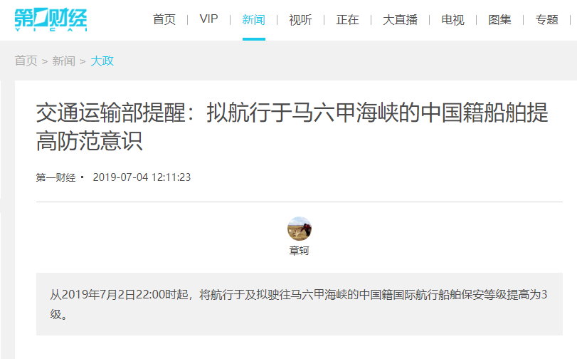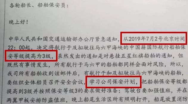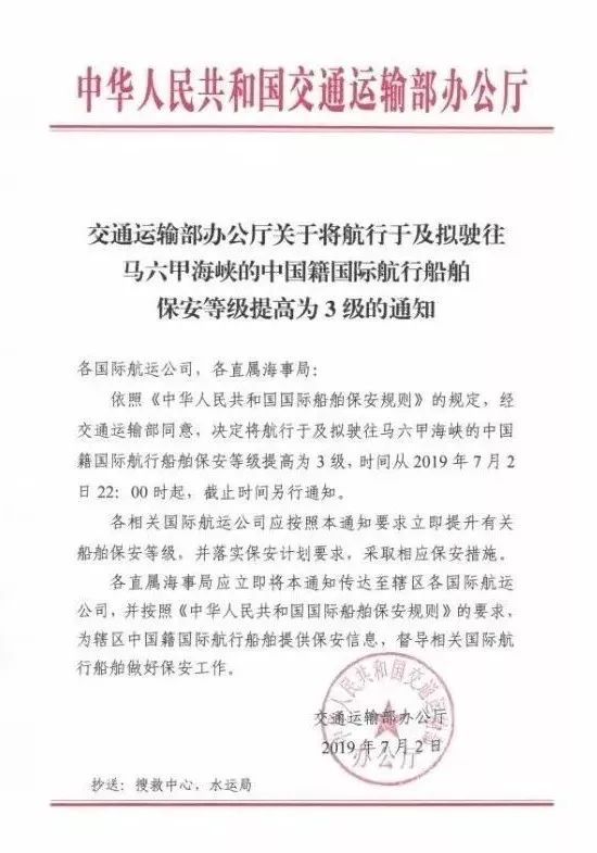 依照《中国人民共和国国际船舶保安规则》的规定,经过交通运输部同意,决定将航行于及拟驶往马六甲海峡的中国籍国际航行船舶保安等级提高为3级,时间从2019年7月2日22:00时起,截止时间另行通知。
