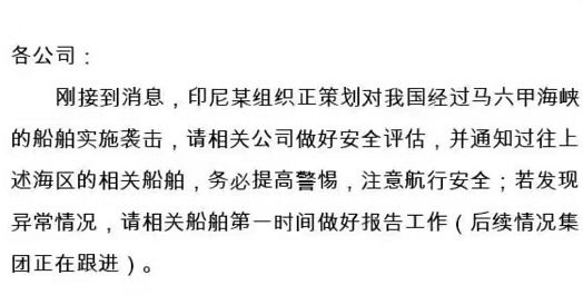 各直属海事局应立即将本通知传达至辖区各国际航运公司,并按照《中国人民共和国国际船舶保安规则》的要求,为辖区中国籍国际航行船舶提供安保信息,督导相关国际船舶做好安保工作。
