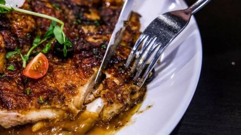 煎鸡排外焦里嫩 淋上酱汁后食用更佳
