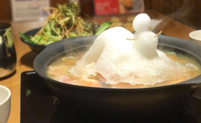 开火后,食客在等上约15分钟后,碎冰就会融化,变成一锅热腾腾的汤底,底下的海鲜类食材也会出现在眼前。业者还特别配合即将到来的圣诞节,用碎冰做成一个雪人,是不是十分可爱呢?