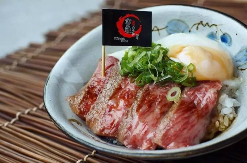 这是最基本的做法之一,将牛肉片和葱油蛋放在白饭上,而且上面还插著旗子。而且用的是和牛肉(A4级),用平底锅煎过了。