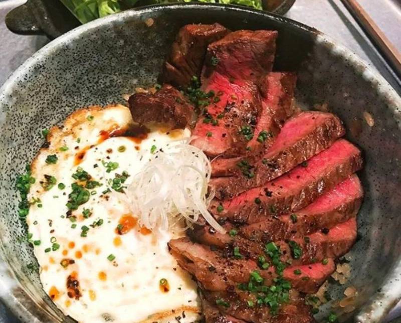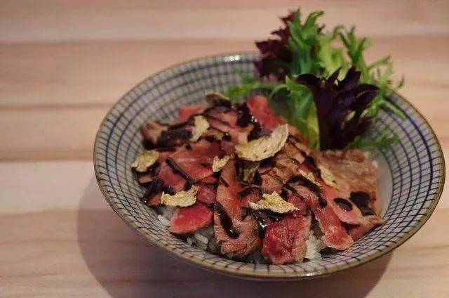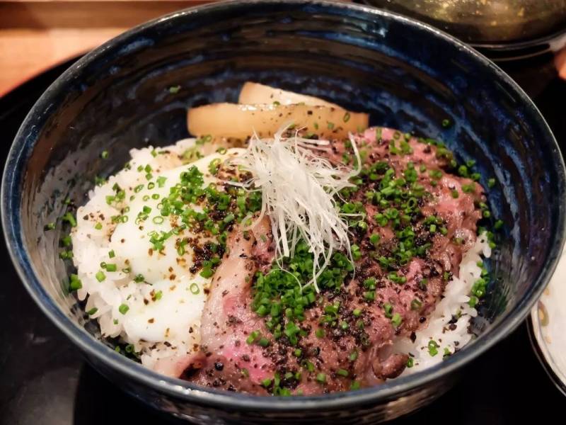 稀滑的鸡蛋包裹着米饭,再将碎碎的芝麻洒在上面,给米饭增添了色彩和口感。然而牛肉饭的决定因素还是要看牛肉,他家牛肉选取的是神户牛肉片。每片牛肉像是刚从烤架上拿下来,外表是熟透的棕色,里面却还是牛肉本身的颜色。看上去就食欲大增!