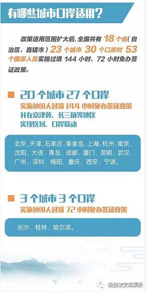 其中,北京、天津、石家庄、秦皇岛、上海、杭州、南京、沈阳、大连、青岛、成都、厦门、昆明、武汉、广州、深圳、揭阳、重庆、西安、宁波20个城市27个口岸实施外国人过境144小时免办签证政策,并在京津冀、长三角等地区实现区域、口岸联动;长沙、桂林、哈尔滨3个城市3个口岸实施外国人过境72小时免办签证政策。
