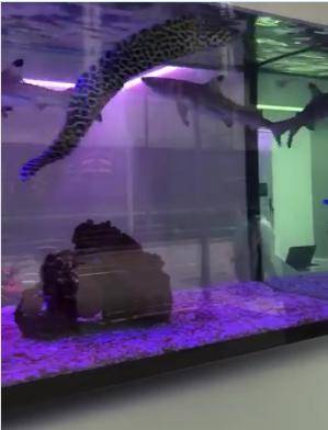 视频中,除了三条幼鲨,鱼缸内还养了一条海鳝。