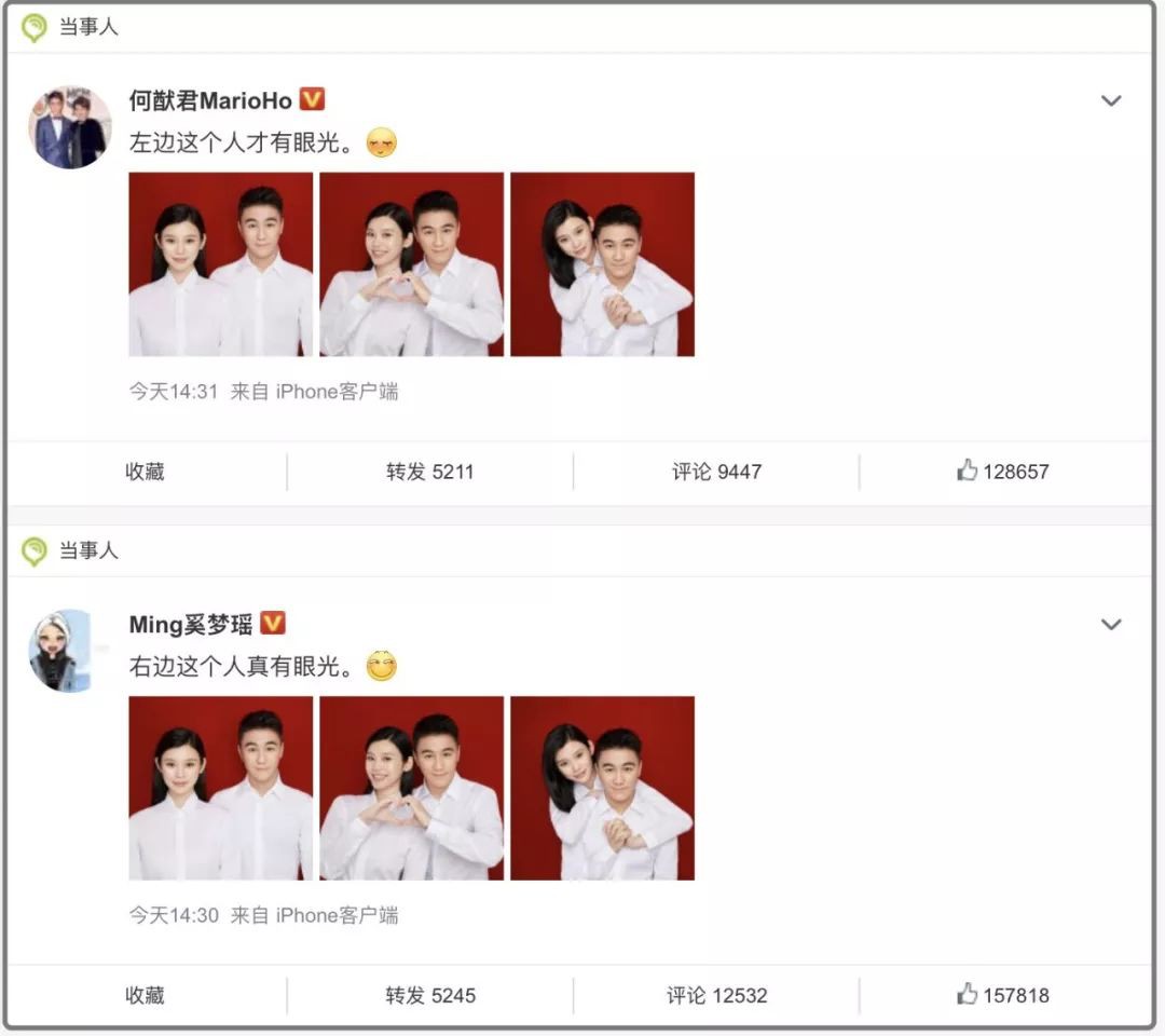 当事人奚梦瑶和何猷君分别在微博晒出了甜蜜结婚照,顺便撒了一把狗粮,互夸对方有眼光……