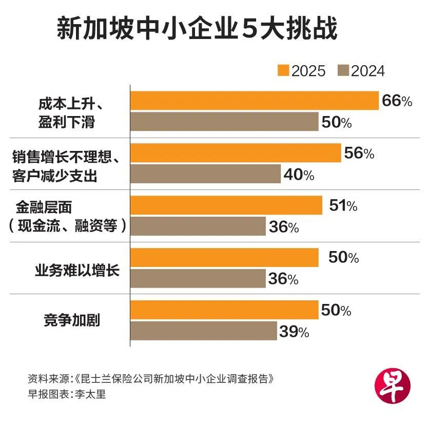 2025年度调查显示,66%受访企业将运营成本上涨与盈利能力减弱列为首要难题,较去年数据上升30个百分点。消费疲软与现金流问题同样引发关注,分别有56%和51%的企业主反映客户支出缩减和融资困难加剧,分别比前一年份提升16%和15%。