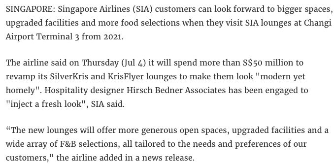 该航空公司表示将花费超过5000万新元来改造其SilverKris和KrisFlyer休息室使其看起来“现代而又温馨”