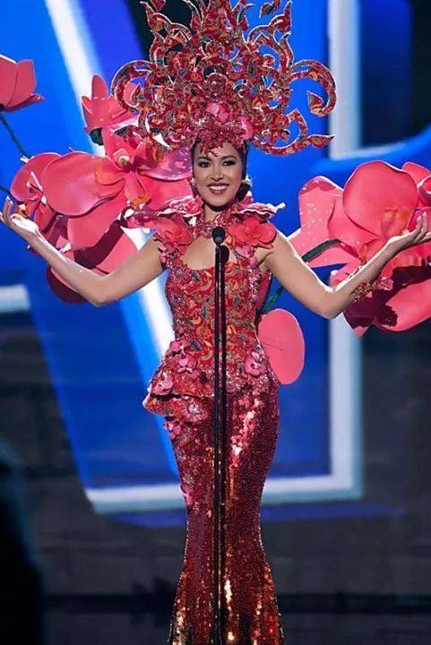 2015年的新加坡环球小姐国服也搭配胡姬花造型的配饰。