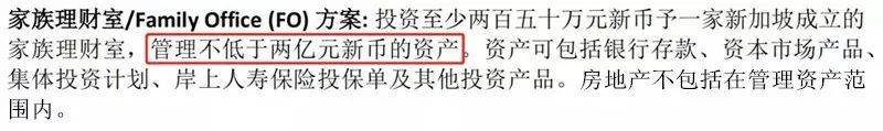 家族办公室(Family Office,简称FO),要求总资产至少4亿新币(约20.5亿人民币),在新加坡设立的家族办公室管理资产至少2亿新币(约10.3亿人民币)的顶尖企业家。