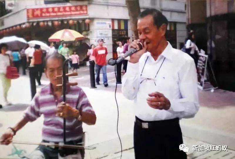 李超群以前街头卖艺时的照片,握著麦克风唱歌的就是李超群。(联合早报)
