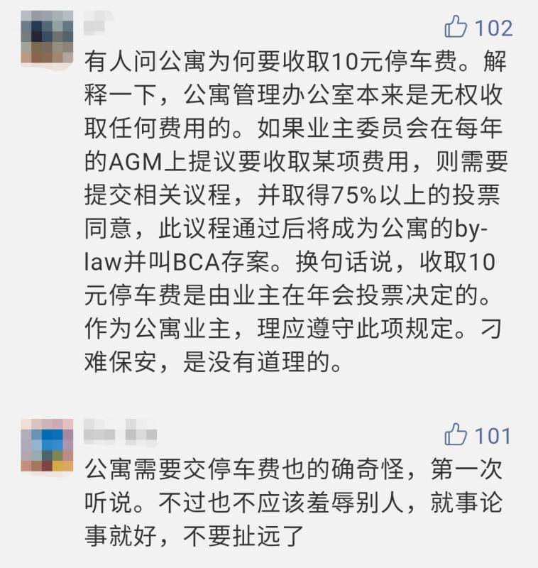 其实,新加坡公寓一般是不收业主停车费的,访客过夜停车费是否征收则另当别论,但就很多住在该公寓的网友反馈得知,似乎确有此事。不过,公寓管理条例是业主委员会定的。但一般来说,相当大部分业主懒得参加业主常见大会,自然也无法控制物业条例的制定。