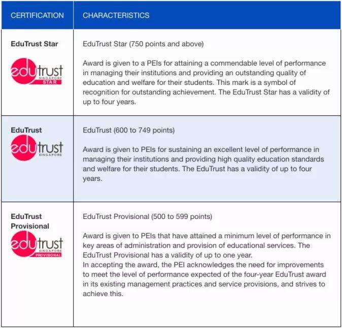 Edu Trust有是一回事,级别又是另一回事。在教学质量、机构管理、学生服务等方面综合评分达到750分以上的私立教育机构,才会被授予教育信托(星级)证书,有效期4年。