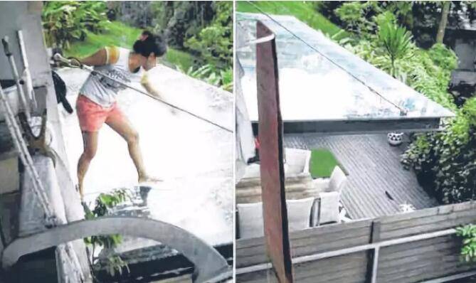 2017年,她家的女佣罗斯被人拍到,下雨天站在洋房的玻璃遮雨棚上洗刷玻璃...