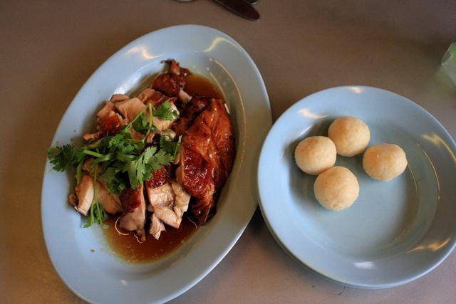 遵循海南人的传统,将整只鸡——最好是老而肥大的,和猪肉一起煮熟,然后将其切成薄片,然后放入鸡汤煮熟的米饭,配上辣椒酱、姜和酱油。