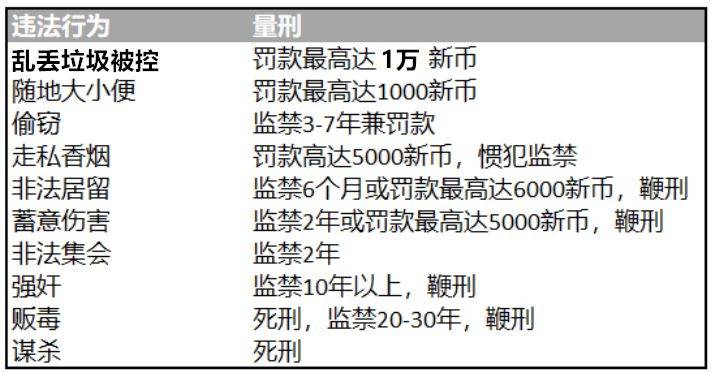 强奸,暴力行为等都可能会面对鞭刑不说。在新加坡涂鸦,酒驾等行为也可能被鞭刑。