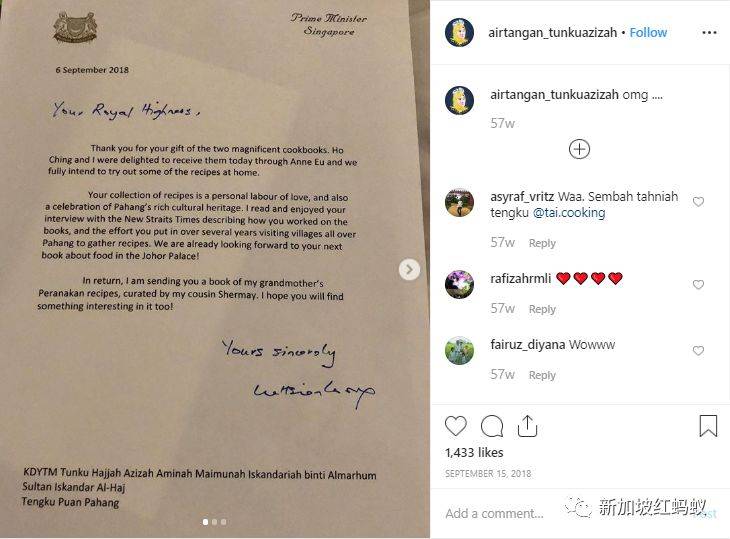 东姑阿兹莎当时将这封信发到Instagram上,兴奋地贴上一句:我的天(omg)!