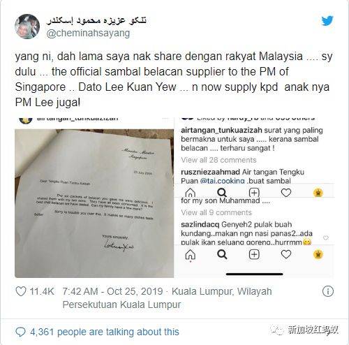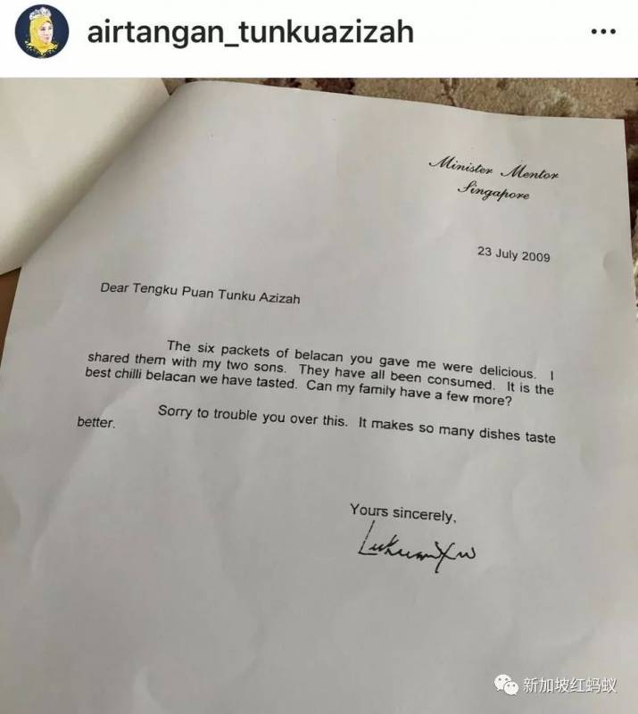 马来西亚元首后自称是李光耀全家的“官方叁峇辣椒酱供应商”(Malaysian queen claims to be 'official sambal belacan supplier' to Mr Lee Kuan Yew and family)