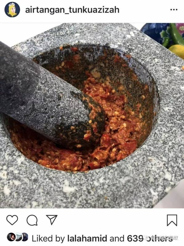 元首后在这个推特文中还附上三张照片,一张是新加坡已故建国总理李光耀的《求辣椒函》,一张是瓶装叁峇辣椒酱的照片(就是上面那张),一张是辣椒原料与调味料在杵臼里紧密结合在一起的照片(就是下面这张)。