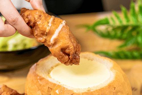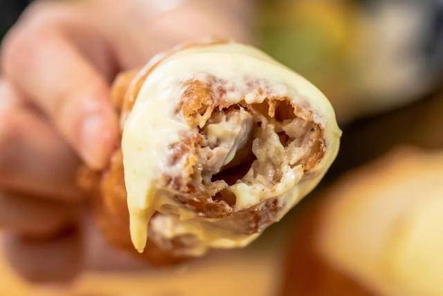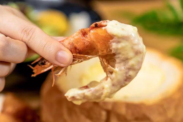 再蘸上这道菜的灵魂——白咖喱芝士,巨拉丝!大虾与炸鸡的咸香与浓郁的白咖喱芝士混合,浓香十足!吃上一块就停不下来!