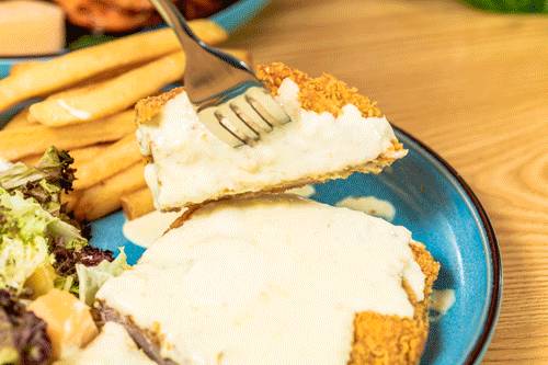淋上浓郁的白咖喱芝士的猪扒,每一块都均匀蘸上,猪扒炸得非常香脆,即使蘸上白咖喱芝士,也没有掩盖它的香味。