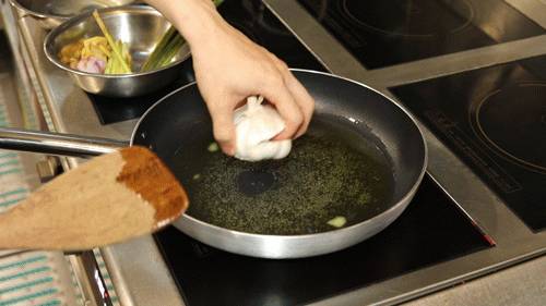先加入新鲜鸡油、斑斓叶、原只大蒜、香茅等材料炒出香味。再加泰国香米炒至变白,颗颗饱满,香气四溢!