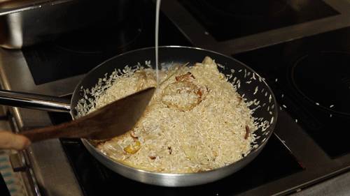 翻炒后再加入椰浆和鸡汤搅拌,米饭被完全吸收!放进烤箱烤1个小时,让香味充分散发!