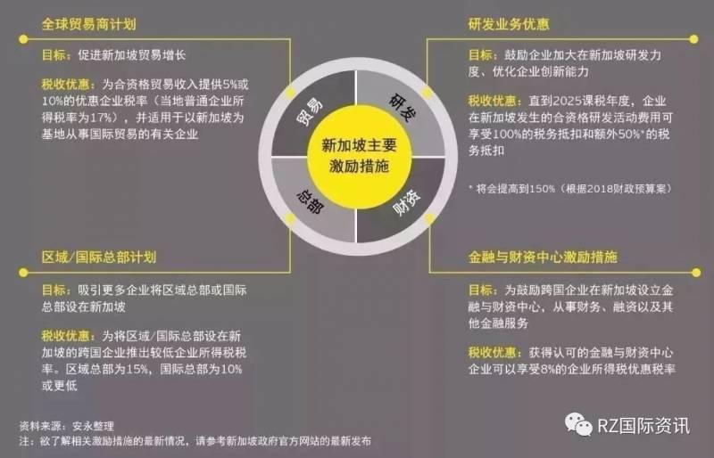 新加坡政府提供广泛的税务激励支持以吸引外商投资。其中,税收激励措施着眼于推动企业巩固在新加坡的大量高增值业务,并提升企业自身在创新能力以及专业技术等方面的水平。为完善新加坡本地营商环境,使之更有吸引力,税收激励措施作为财政政策工具,能有效突显新加坡作为全球主要营商和投资枢纽的地位。