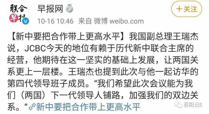 二.【新中要把合作带上更高水平】我国副总理王瑞杰说,JCBC今天的地位有赖于历代新中联合主席的经营,他期待在这一坚实的基础上发展,让两国关系更上一层楼。王瑞杰也提到此次与他一起访华的第四代领导班子成员。“我们希望此次会议能为我们(两国)下一代领导人铺路,加强我们的双边关系。”