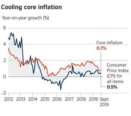 【核心通货膨胀率不包括住宿和私人交通费用,这些费用受到政府政策的影响较大】这些数据与彭博社(Bloomberg)调查分析师们的预测吻合,他们的预测就是整体通货膨胀率为0.5%,核心通货膨胀率为0.8%,与8月份相似。