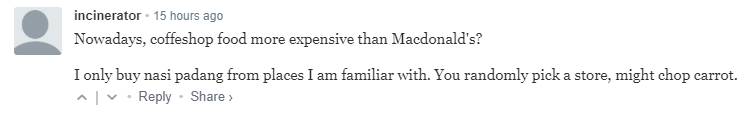 这年头,食阁比麦当劳套餐还贵!我一般只从熟悉的马来杂菜饭档口买,随便买可能会被“砍菜头”(挨宰)