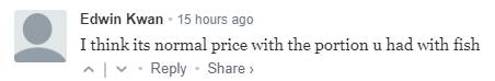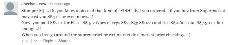 大哥,你知不知道这么一块“鱼”如果你从超市买来,可能要花4+新币或者更多。现在你只花了7新币多一点,还有两个菜、鸡蛋和米饭!