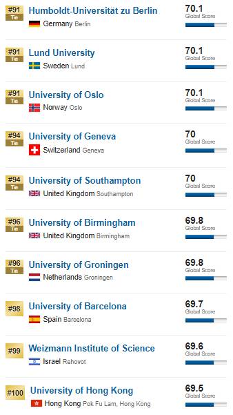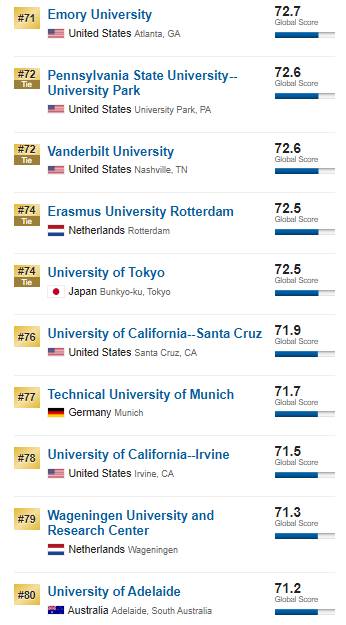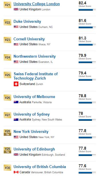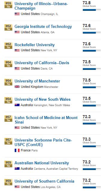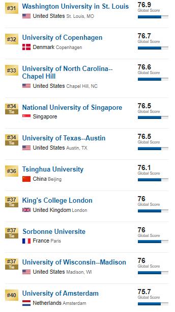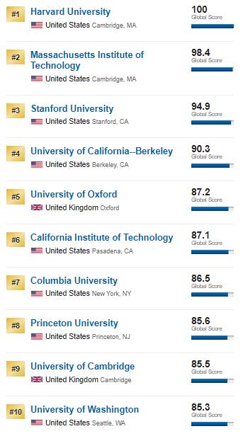 US news排名每年发布一次。学校的排名由13个指标决定,这些指标涵盖了学术科研水平、全球和区域声誉等多个方面。今年是US news第六次发布,榜单已扩大到来自80多个国家的超过1500所高校,以期对全球的研究型大学做全面的评估。