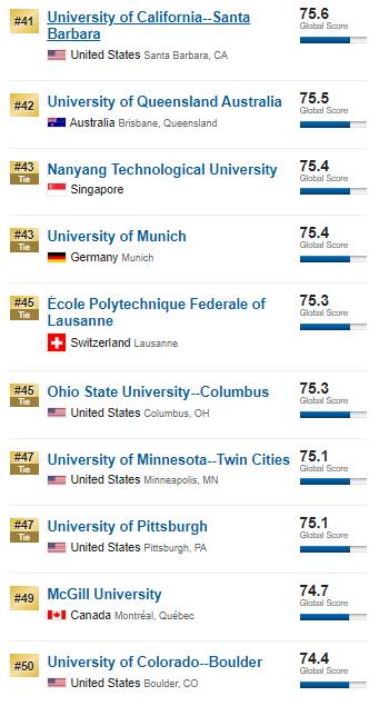 在今年最新的US news世界大学排名中,NTU延续往年的势头,继续前进6名,排名第43位,并有5门学科排进前五。同时,在亚洲大学的排名中也排在第3位。