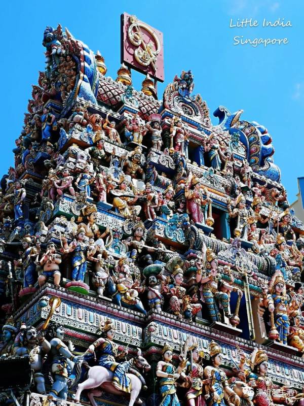 恰逢周六,小印度的著名小寺庙热闹非凡(维拉玛卡里雅曼兴都庙…名字好难记),门楼上有很多印度教诸神明的彩色雕刻,寺庙墙壁被涂成红白色,虔诚的信徒和游客必须要脱鞋入内。