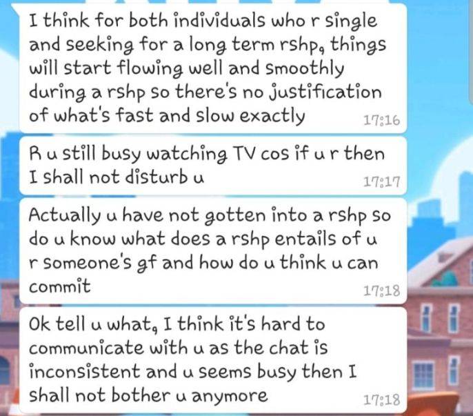 “关系需要承诺和努力来实现,所以我想如果你还没有准备好迈出一大步,不太可能有新加坡人愿意和你在一起,我们和马来西亚人可不同。”