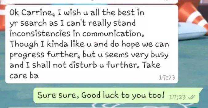 “好的Carrine,祝你一切顺利,反正我是受不了这种无效沟通。