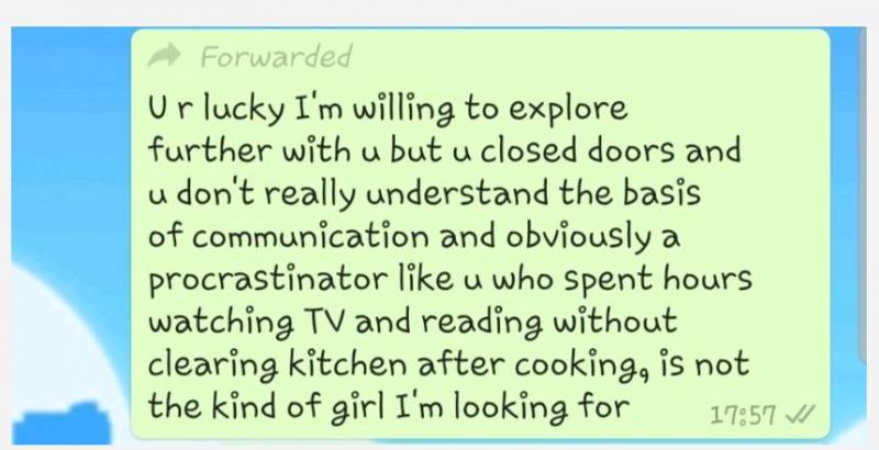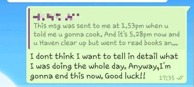 “你在下午1:53分的时候发我这条信息,说你要去做饭了,现在已经5:38分了,然后你没有整理好,就去看书看电视了吗?我的天,哈哈”
