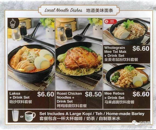 请注意菜单中叻沙被归类为面条(Noodle)。因此叻沙是一种汤面,在马来西亚其他地方,叻沙的主料是小麦粉制成的面条,加东叻沙却用的是软软的米粉,也就成了汤粉。米粉的英语是 rice noodle(米面条),说是面条也没错。如果看食材,叻沙有中式料理的基因:米粉、油豆腐、鱼饼、豆芽之类,加东叻沙的标志是加入一颗切成两半的白水鸡蛋。