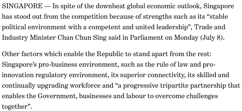 政治稳定,称职领导才能是使新加坡在全球前景疲弱的情况下保持领先地位的因素之一