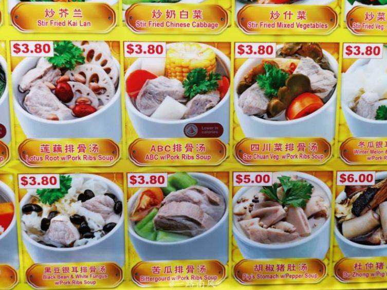 熟食中心的商家都会把商品明码标价示人,相对贵一点的是各类炖汤,比如胡椒猪肚汤,售价为新加坡币5元,换算成人民币约25元左右;各类排骨汤的价格是3.8新加坡元,换算成人民币19块钱多一点。如果不想吃已经配好的快餐,也可以选择点炒菜,品种有炒奶白菜,炒芥兰等等,价格稍高,熟食中心通常很大,遍布城市各个角落,里面有很多小店可供选择。