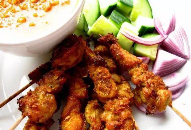 炭火烘烤后的肉串(鸡、牛或羊肉)散发出鲜香可口的香味,蘸点甜辣的花生酱。沙爹来自福建话,意思是“三块”,而每个沙爹恰巧就是三块。