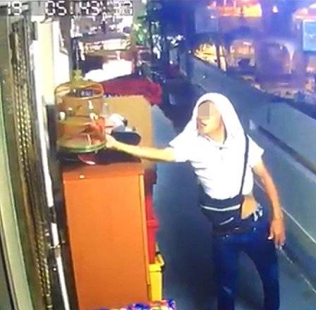 贴文内包含3段视频,根据视频,身穿白色上衣的男子将衬衫拉到头上,露出腹部及半张脸。男子左顾右盼,从鞋架上拿走一个鸟笼后,便迅速离去。