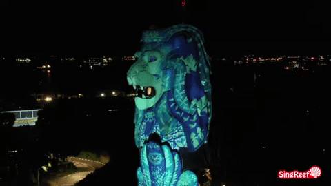 夜幕降临后,灯光勾勒出鱼尾狮的轮廓,俯瞰著整个圣淘沙岛.......