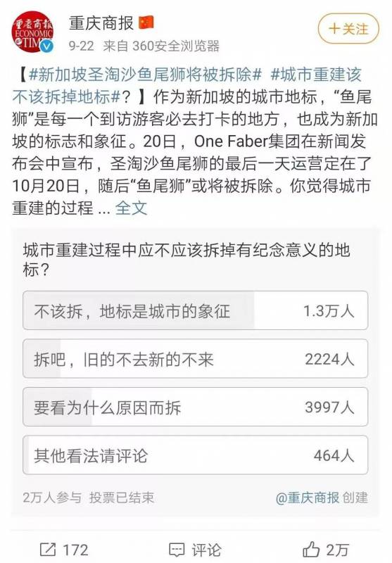 在微博发起的投票活动中,超过1.3万人投票表示不舍,很多人留言遗憾自己没有机会去圣淘沙鱼尾狮打卡。