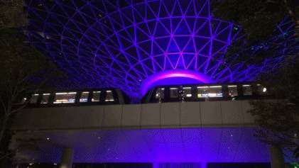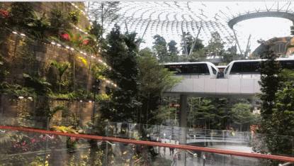 从星耀樟宜中间穿越而过的轻轨,打破了植物园和瀑布的向心结构,增加了室内的活跃气氛。