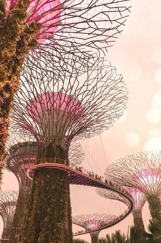 在这些参天巨树22米高的位置,有一条128米长的空中过道。黄昏时分,你可以在这里享受滨海湾的无边日落,入夜后,树梢上的灯光秀又如同夜空中不灭的烟火,所有的浪漫都在擎天树下上演。